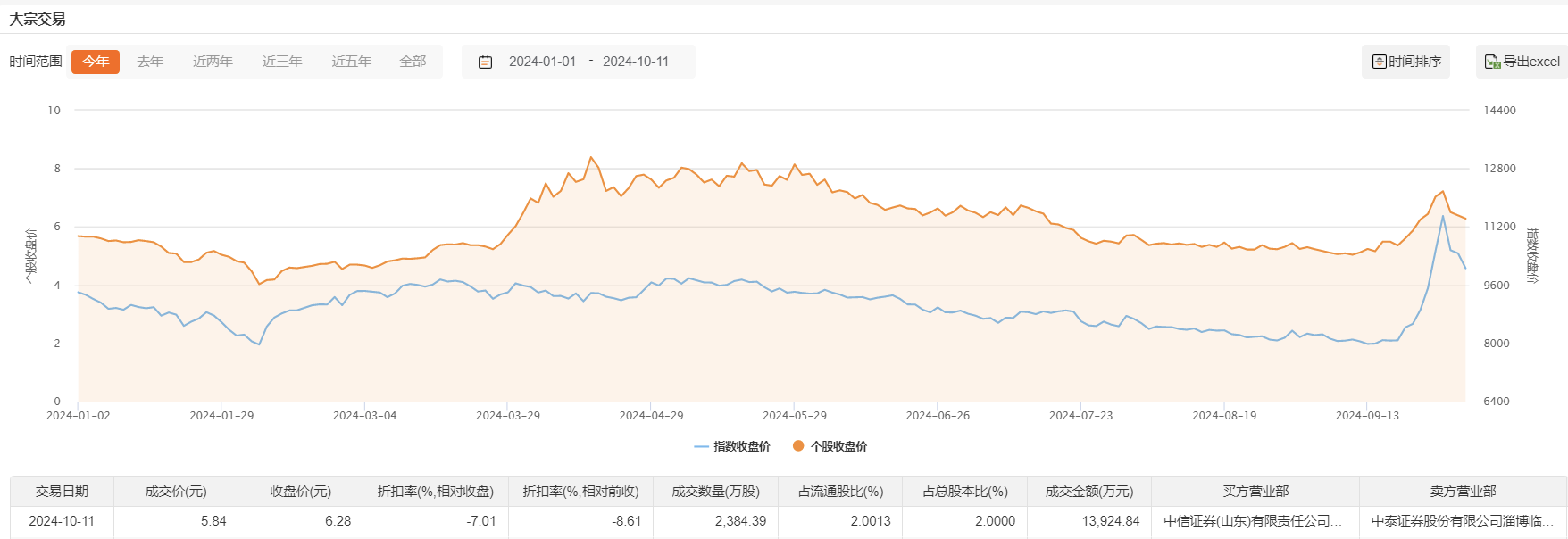 焦作万方今日大宗交易折价成交2384.39万股,成交额1.39亿元