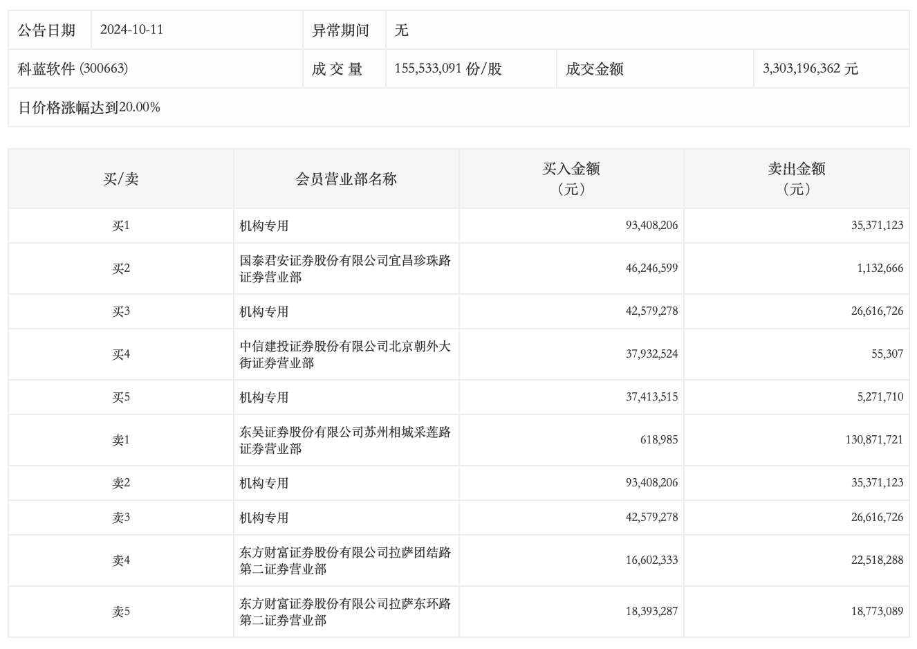 龙虎榜丨科蓝软件今日涨停,三机构净买入1.06亿元