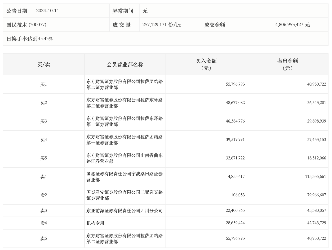 龙虎榜丨国民技术今日跌12.91%,一机构净卖出1408.43万元