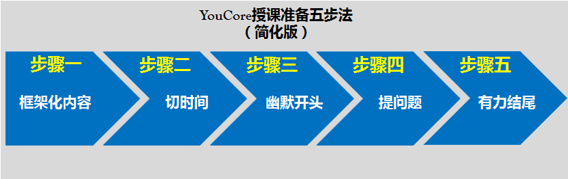 因此,要克服讲课的恐惧,治标的方法可以是心灵鸡汤般的自我催眠:丢脸了又怎样呢,我根本就不在意你们这班傻X;但更治本的方法应该是通过有效的授课准备以建立绝对自信。以下是我基于YouCore培训体系为表妹简化提炼的五步法: