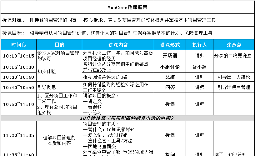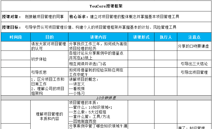 一个专业的课程设计涉及的内容非常多,从价值主张到学员驱动力、培训理念、教案、教法、学习活动、讨论案例、练习题、作业题等等,既然表妹只是内部分享上上课,没必要像YouCore这么专业,直接关注能帮助自己讲得下来的部分就好了。