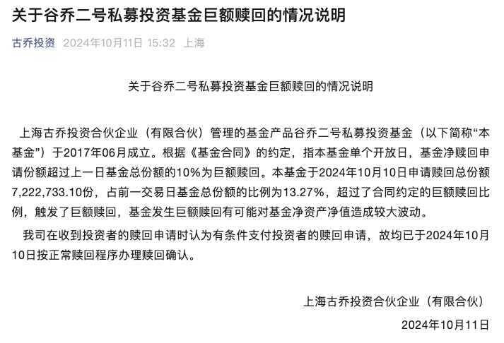10月11日,上海古乔投资合伙企业(有限合伙)发布情况说明,其管理的基金产品谷乔二号私募投资基金于2024年10月10日申请赎回总份额7,222,733.10份,占前一交易日基金总份额的比例为13.27%,超过了合同约定的巨额赎回比例,触发了巨额赎回,基金发生巨额赎回有可能对基金净资产净值造成较大波动。公司在收到投资者的赎回申请时认为有条件支付投资者的赎回申请,故均已于2024年10月10日按正常赎回程序办理赎回确认。