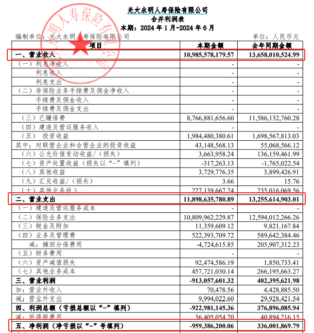 2024年上半年,光大永明人寿实现净利润为-9.59亿元,较上年同期的3.36亿元下降12.95亿元。