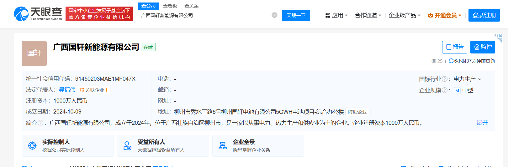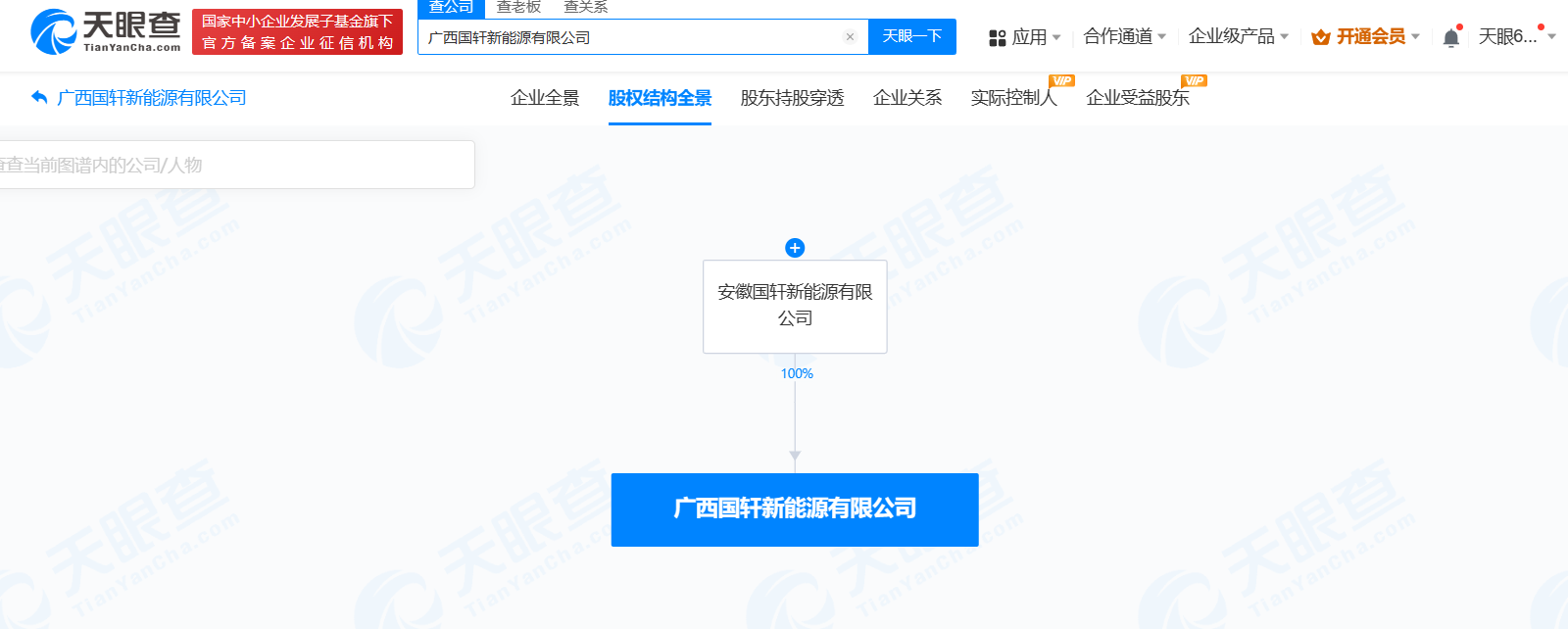 据每经网消息,天眼查App显示,近日,广西国轩新能源有限公司成立,法定代表人为吴福伟,注册资本1000万人民币,经营范围含风力发电技术服务、风电场相关系统研发、新兴能源技术研发等。股权全景穿透图显示,该公司由安徽国轩新能源有限公司全资持股,后者为国轩高科(002074)全资子公司。