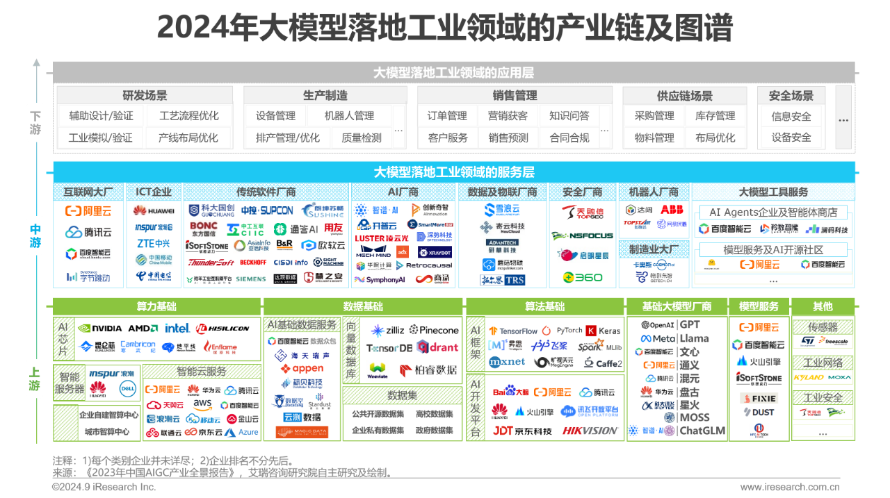 上游服务方整体集中,且头部效应明显;中游市场参与玩家众,虽服务能力各有侧重,但结合行业know how/行业数据积累进行基础大模型微调、RAG是主要服务思路;下游市场需求广阔,但尚处于探索阶段