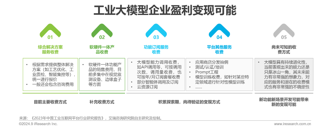 虽然一些基础大模型的厂商API调用是目前较为普遍的变现方式,但深入到工业大模型服务领域,API调用、智能体调用及分发抽佣等方式的变现还处于积累阶段,目前市场还需要验证。