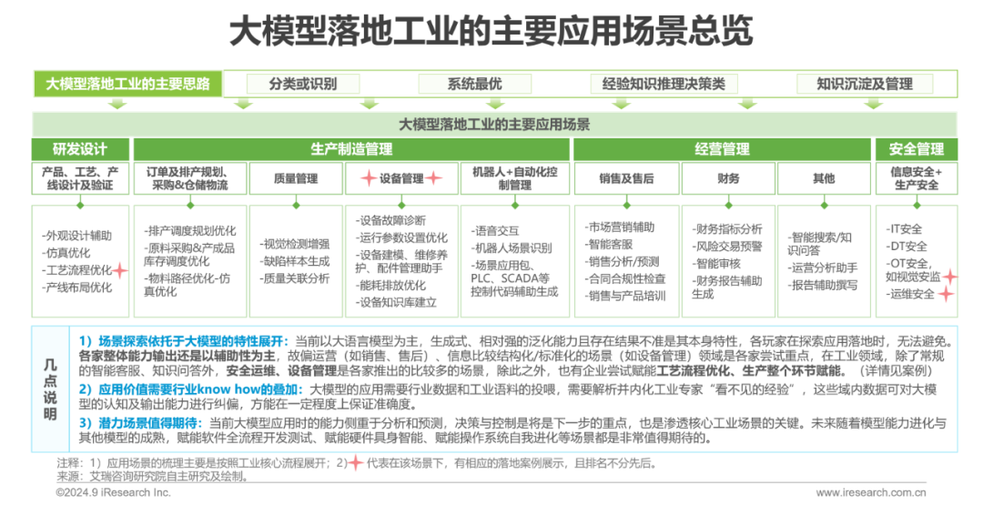 偏运营的、有一定容错能力的场景是当前重点,生产制造等核心场景的探索需要静待模型进化以及CV大模型、多模态大模型的发展