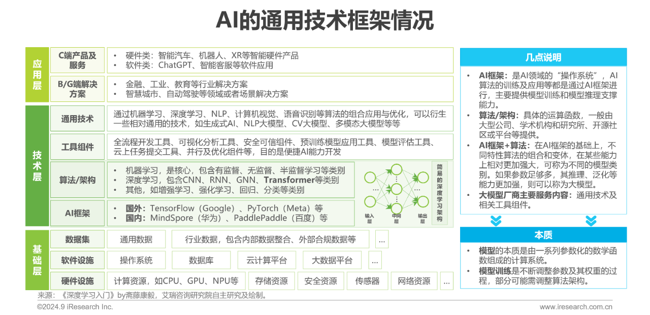 整体来看,AI通用技术框架主要分为基础层、技术层、应用层三层,不同公司,在整体框架上都保持一致,只不过针对基础层和技术层的部分内容划分,略有区别,但主旨就是为各类函数组成的计算系统提供环境、数据、算力等支撑,最终达到模型运行并输出结果的目的。具体到不同层级的主要玩家而言:1)基础层和技术层的AI框架和算法/架构上,其玩家比较类似,主要是国内外领先的科技巨头、云厂等参与,如谷歌、Meta、微软、亚马逊、阿里、百度、华为等;2)应用层和技术层的工具组件、通用技术,其玩家更加百花齐放,针对行业、场景、功能等各角度发力,推动AI工具和应用的落地。当前,大部分大模型玩家的侧重点更多聚焦于通用技术的提升、应用的领域的拓展。