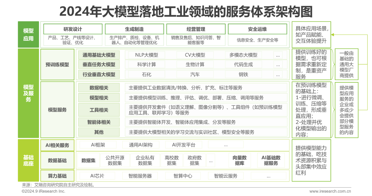 大模型落地工业领域的服务框架依然分为基础底座-模型及服务-模型应用三层。其中,模型及服务是核心,主要提供两大类型的服务:1)提供预训练模型,可供其他企业通过调用/部署,提供基础的大模型能力;2)提供预训练模型后服务,如辅助微调、提示工程、训练、压缩、优化等,可供模型能力进一步适配与适用。当前,工业大模型市场的模型应用都是在大模型的基础能力+模型的适配与适用的基础上进行定制衍生的。