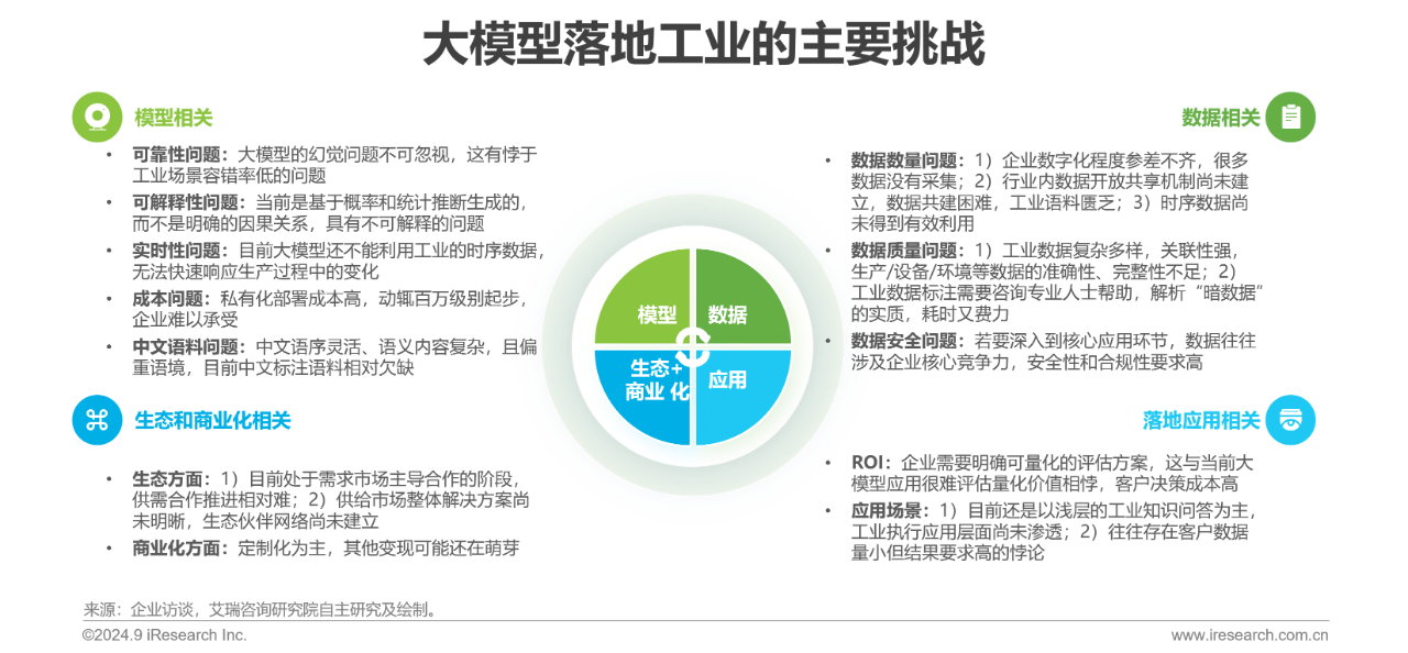 大模型落地工业的挑战主要聚焦于模型、数据、应用、商业变现几方面。针对模型:其根本是模型本身的问题,即存在幻觉、不可解释性、成本高等问题。针对数据:更多是数据共享性、数据质量等问题。针对落地应用:则关乎决策成本和应用深度等问题。针对商业化:则与前面三大挑战息息相关,即模型与数据相互促进,模型进步将推动应用落地,应用的推进能带来更好的商业化变现。