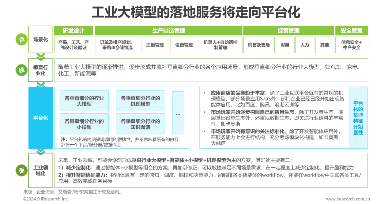大模型虽然在一定程度上具有泛化能力,但具体到应用时,需要进行微调等操作,其具有很强的定制属性,如何减少重复性工作,甚至减少定制化是各供给方共同探讨的命题。而行业大模型+智能体+小模型+机理模型为主的平台化调用方案似乎成为大部分企业的共同选择。但有两点需要注意:1)平台化强调知识沉淀、工具等调用的便捷性,而不拘泥于存储形式/路径;2)大模型工业应用时,其演进具有一定阶段性,基本遵从场景-垂直细分行业-工业领域的路径。