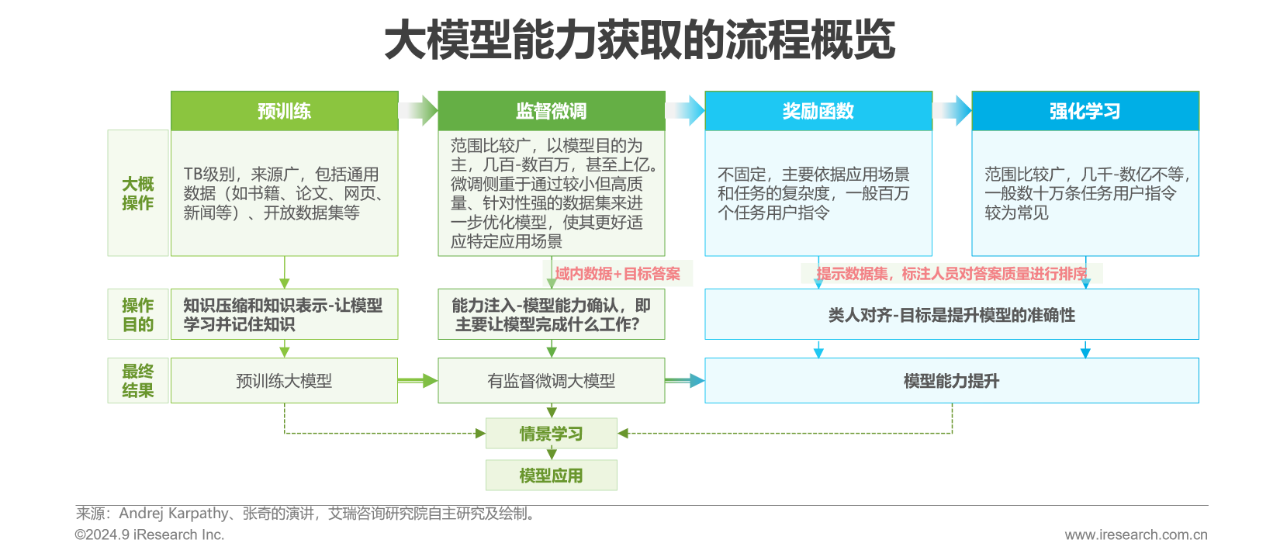 据Andrej Karpathy所言,大模型本质由巨大的参数文件+运行参数的代码文件两大核心组件构成。其中:1)参数文件是通过大量数据训练获得的,代表从数据中提取的有用信息和模式(可称为“知识”),其参数量与对知识的记忆能力,与数据量、数据按照不同说明进行曝光的次数有关。2)代码文件有点类似“大脑”,主要是指导参数文件进行推理和产出,其中,可根据域内数据、提示数据集等进行调参,不断提升模型的准确性。因此,总结来看,大模型能力获得主要有四步:1)针对大量数据进行预训练,让大模型学习并记住知识;2)明确大模型能力侧重点,即给一定高质量、针对性强的域内数据集微调,让大模型在某些能力更加突出;3)通过标注人员对大模型给出的答案进行排序,给予大模型正向反馈;4)强化学习。以上,也说明大模型的能力不是只要参数量足够大就具备涌现能力,是需要逐项优化才逐步具备某些能力的。需要注意的是,大模型本质是一个概率模型,可从2个角度理解:1)具有不可解释性:虽然可以调参,但是并不知道这些参数在做什么,如何协同工作,表示的是什么意思;2)幻觉不可消除:模型的工作机制是基于概率和统计推断进行的,而非真正的理解和逻辑推理,且与预训练的数据量、曝光次数、微调数据量及数据的选择、奖励函数偏好等息息相关。
