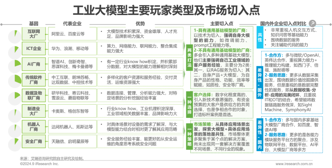 根据基因不同可将工业大模型厂商分为8类:1)互联网大厂、ICT企业、AI厂商,强调AI原生能力和基础大模型能力;2)传统软件厂商凸显客户服务经验、运营资源优势;3)制造大厂、机器人厂商彰显行业know how、行业数据、设备应用等优势;4)安全厂商侧重在企业全局运维中的安全保障。综合来看,虽然各家优势有异,但切入市场的策略相似,即:锚定自身优势点,围绕具体应用场景摸索大模型在工业的落地性,且目标都是有钱、技术底蕴、有意愿的头部客户。当前,对比国内外企业的市场切入思路,主要差异有二:1)在合作方上,国外企业具有资源顶端优势,强调从算力底层出发,构建算力-推理的能力地图,而国内企业则强调底层大模型的能力与丰富性;2)在服务思路上,国外企业相对更强调将数据链路服务体系做深,而国内企业更强调各功能模块间的组合。