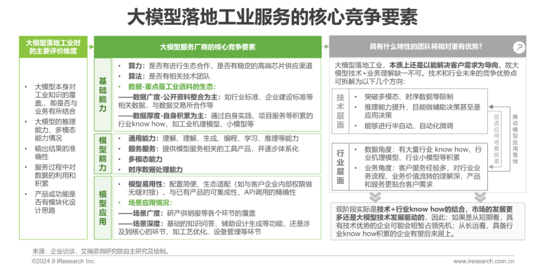 大模型落地工业,本质上还是以能解决客户需求为导向。从需求方角度看,客户主要关心两点:结果准确性+服务于业务。因此,对于供给方而言,模型技术与业务理解缺一不可,只不过具有不同基因的企业,在基础能力、模型能力、模型应用这三方面所具备的优势不同,但这三方面是大模型落地的主要竞争要素,且不同发展阶段其相对优势也有所不同。具体而言:从短期来看,工业大模型行业是大模型技术发展带来的,以模型技术推动行业发展为主,此时,具有技术优势的企业将占领先机;从长远来看,技术本身是为行业服务的,故具有行业know how积累的企业反而能推动行业走的更远,其相对优势将会更加明显。