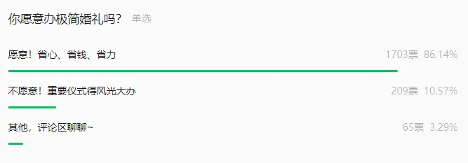 从央广网发起的一则投票结果也可以看出,有超八成的年轻人表示愿意办一场省心、省钱、省力的极简婚礼,更注重的是婚礼所提供的情绪体验。