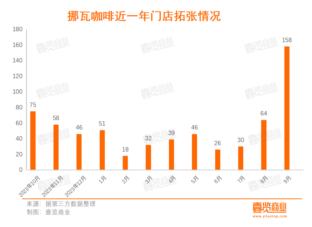 最近三月,挪瓦咖啡动作不断。先是官宣中国女子田径运动员吴艳妮担任其“低热量”健康大使,再是在济南开出了一家“彩票+咖啡”的复合型门店,近日还完成了数亿元B++轮融资用于供应链、全新的产品研发。甚至在9月,挪瓦咖啡的门店增量达到近一年最高,单月开店158家。