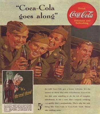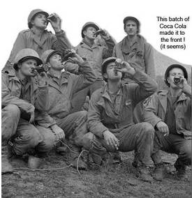 因为战争的爆发,可口可乐的销售受到了严重的影响,罗伯特·伍德鲁夫非常的头疼,也就是这个时候,他的一个朋友从战场打来电话,折让其茅塞顿开,如果战场上的美国大兵都能饮用可口可乐,那么当地人也会饮用,这对可口可乐的市场扩张无疑是非常大的助力。而且一线作战的士兵非常需要一种能够保持神经兴奋的方法,之前军方使用的是香烟和酒精,但很显然这不是一个很好的选择。可口可乐的特性能够成为替代产品。可口可乐伴随美军士兵征战世界,由此可口可乐已经不仅仅是休闲的饮料。更是成为了如同枪和子弹一般的必需品。
