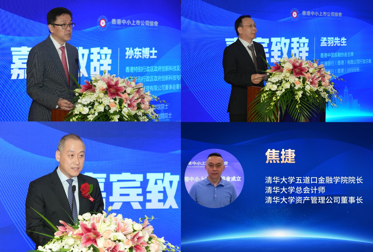 活动伊始,香港创新科技及工业局局长孙东博士,香港中国金融协会主席、交通银行(香港)有限公司行政总裁、交通银行香港分行行长、JP(太平绅士)孟羽先生,香港立法会议员、大唐资本控股有限公司行政总裁李惟宏先生等,分别致辞并祝贺香港中小上市公司协会正式成立;清华大学五道口金融学院院长、清华大学总会计师、清华大学资产管理公司董事长焦捷博士以视频方式送上祝福。