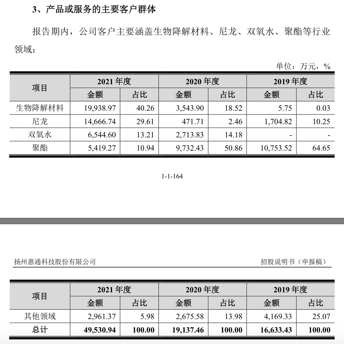 根据2022年6月17日的申报稿,惠通科技2021年生物降解材料领域的收入仅2亿元,占比40.26%,这是从2019年的0.03%占比一路狂奔上来的。