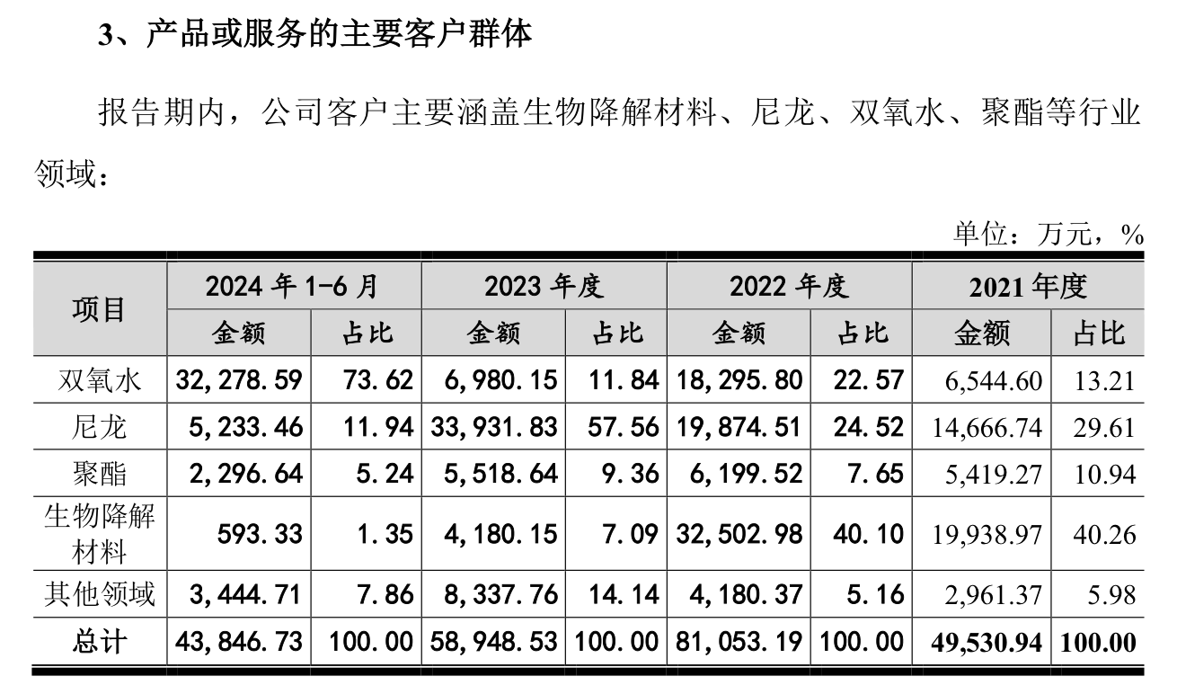 与之对应的是,双氧水业务的收入崛起,2021年金额6544.6万元,占比还为13.21%;2022年金额1.83亿元,占比22.57%;2023年该业务又出现回落,金额6980.15万元,占比11.84%;2024年上半年金额3.23亿元,占比73.62%。