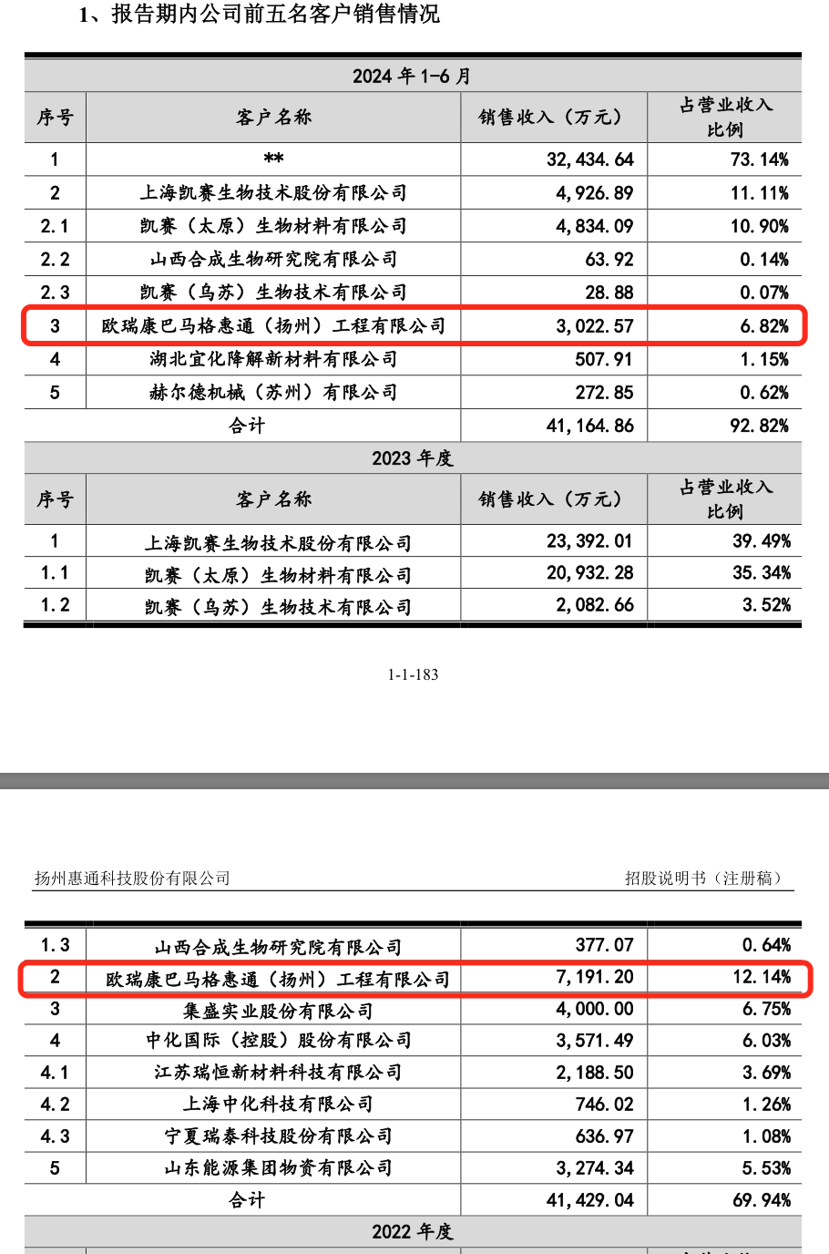 从早期的申报稿数据看,2019年和2020年惠通科技对OBHE的销售收入占比分别为35.15%和46.01%。如今2024年上半年已降为6.82%,比例下降了不少。