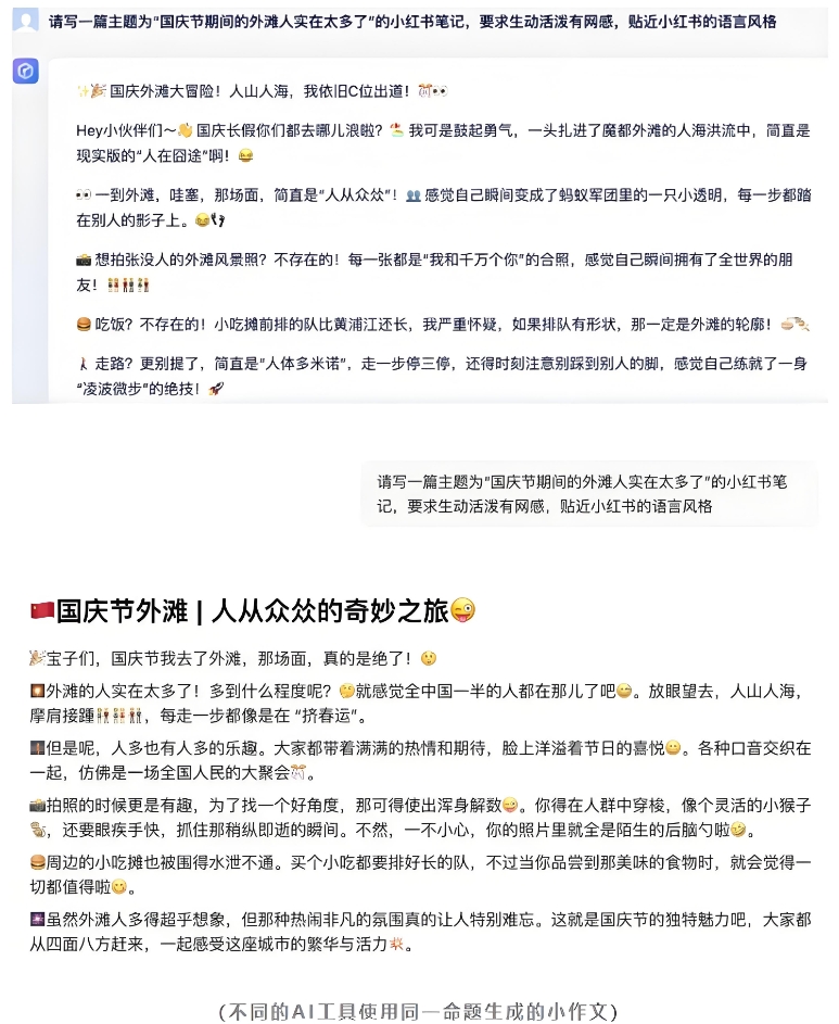 举例来说,如果想要利用AI写一段小红书文案,你会发现,AI理解的小红书文案基本上就是一段故作活泼且正能量的小学生作文中插入大量emoji,结尾再加上#关键词#,想要的“网感”就是加入大量流行语,冲浪时间久一点的网友都会感到尴尬,并且有意思的是,不同的AI工具生产的文案从语言风格到文章结构都几乎雷同。