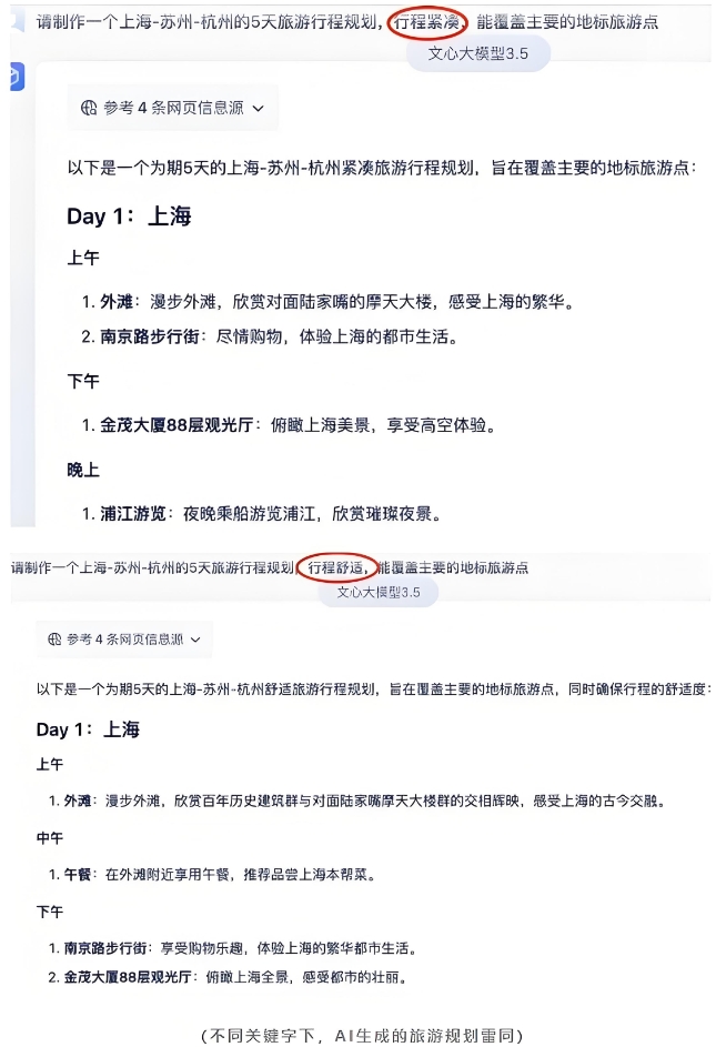 就在刚刚过去的国庆假期中,不少人在尝试使用AI工具进行出游规划,只要向AI说明自己的要求就能生成一个还不错的旅游攻略,看上去很方便,但实际结果不尽如人意。笔者测试了利用AI制作旅游攻略,但在关键词“行程紧凑”和“行程舒适”明显不同的前提下,生成的行程规划并没有什么区别,仅仅是舒适的行程中增加了午餐环节,可能AI认为紧凑的行程不需要吃午餐,或者有午餐就代表着行程舒适?AI显然是读到了关键字,但是并没有像“人”一样理解关键字。