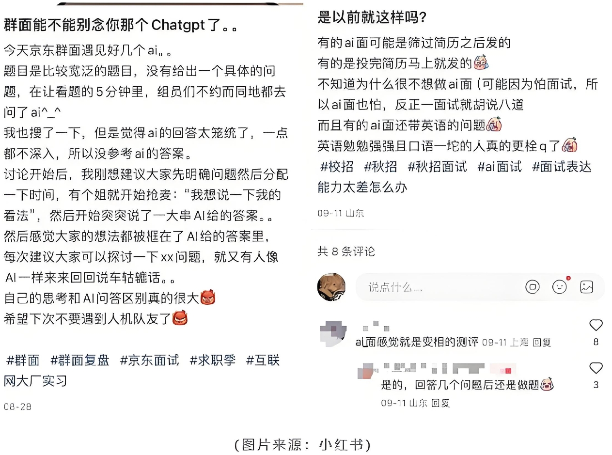 在如今的求职市场上,AI辅助面试也得到了广泛应用。一方面,求职者利用AI工具准备面试问题和答案,提高了效率,但是思路容易落入AI的窠臼,而不是贴合自己实际情况,展现个人独特的魅力。另一方面,企业用AI数字人对求职者进行面试筛选,节约人力物力,但面试问题千篇一律,缺乏个人特色,使得求职者为了“讨好”AI面试官而不得不小心翼翼地适应AI面试的风格。原本是为了提升面试效率,简化沟通流程,却成了求职者必做的新八股文。