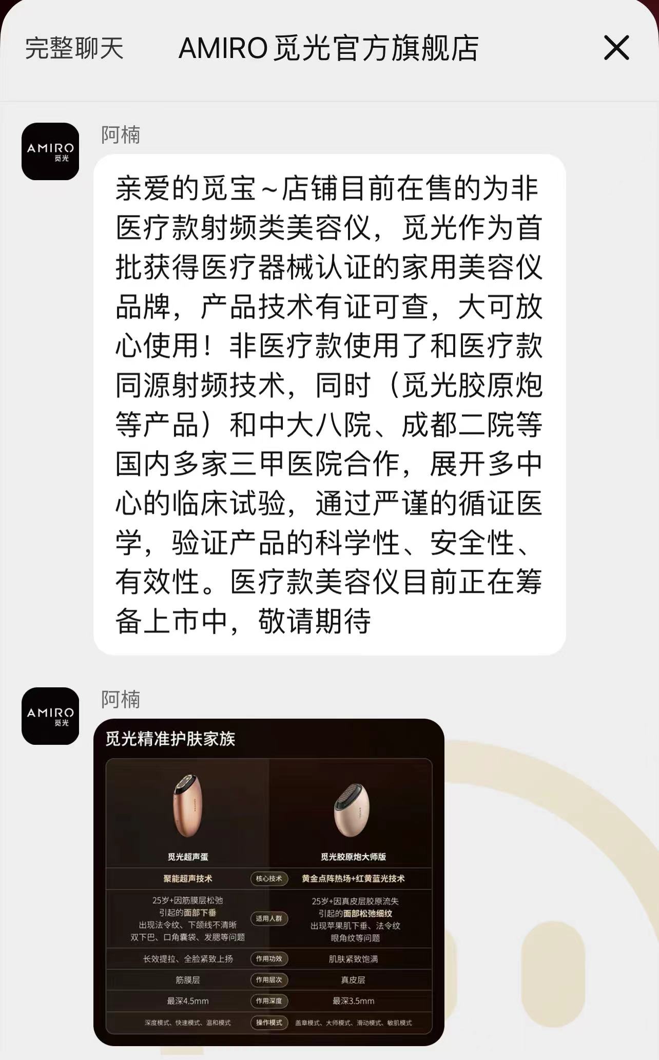 据觅光客服介绍,其淘宝旗舰店当前销售的都是非医疗使用的家用美容仪,但却声称产品采用与医疗款相同的射频技术。