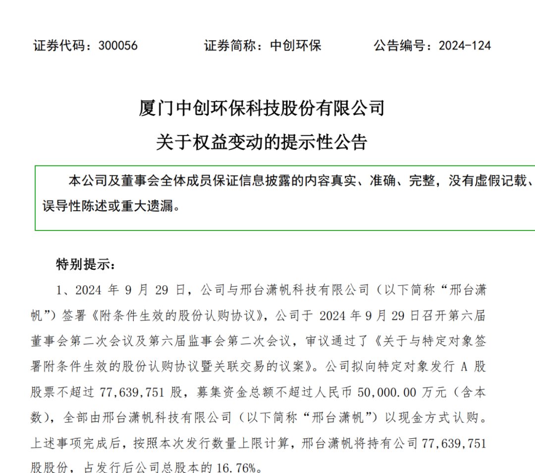 10月8日,中创环保发布公告称,公司计划向邢台潇帆科技有限公司(下称:邢台潇帆)发行不超过7763.98万股,募集资金总额不超过5亿元。