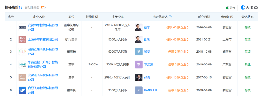 此外,目前,胡郁还在上海聆芯科技有限公司、湖南芒果听见科技有限公司、华南脑控(广东)智能科技有限公司、安徽讯飞至悦科技有限公司等17家公司担任高管;以及深圳市达晨创联股权投资基金合伙企业(有限合伙)、安徽讯飞创业投资合伙企业(有限合伙)等35家公司担任股东。这些公司绝大多数都是与科技产业相关。