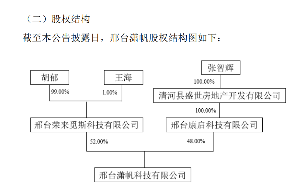 邢台潇帆由邢台荣来觅斯科技有限公司(下称:邢台荣来)和邢台康启科技有限公司(下称:邢台康启)直接持股,持股比例分别为52%、48%。其中,邢台荣来由胡郁直接持股99%,王海直接持股1%;邢台康启由张智辉通过清河县盛世房地产开发有限公司间接全资持股。胡郁为邢台潇帆的实控人。