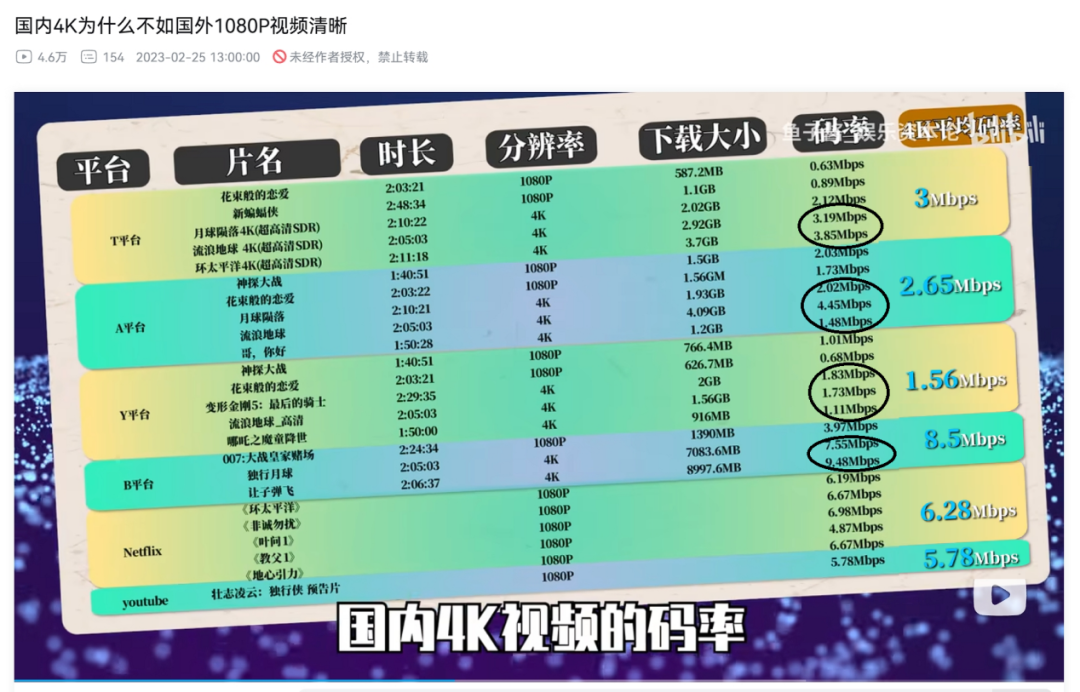 其实影视飓风这个视频的同一主题,在2023年年初娱乐资本论就做过同类梳理:《国内4K为什么不如国外1080P视频清晰》。