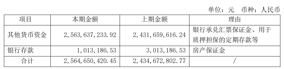 值得注意的是,公司62.26亿元货币资金中能随时动用的现金则为36.61亿元。其余25.65亿元资金属于房产保证金及银行承兑汇票保证金。