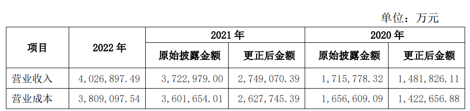 数据显示,2020年、2021年公司初始营业收入披露金额分别为171.58亿元、372.30亿元,更正后营业收入金额分别为148.18亿元、274.91亿元,均较初始披露金额差别较大。