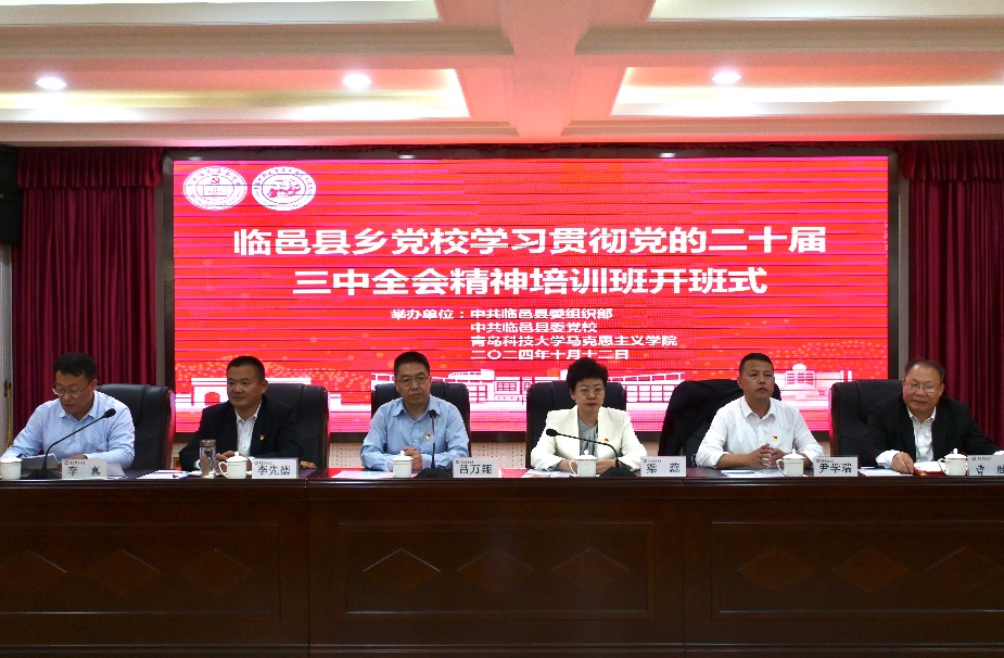 为深入学习贯彻党的二十届三中全会精神,深刻领会进一步全面深化改革的主题、重大原则、重大举措和根本保证,在学习宣传研究贯彻全会精神上走在前、当先锋,10月12日临邑县乡党校学习贯彻党的二十届三中全会精神培训班在青岛科技大学举行。培训班由中共临邑县委组织部、中共临邑县委党校、青岛科技大学主办。青岛科技大学党委常委、副校长吕万翔,临邑县委常委、组织部部长、统战部部长梁蕊、临邑县委党校主持日常工作副校长李先德、临邑县委组织部副部长尹学瑞、青岛科技大学德州融创中心主任刘伟出席开班仪式。来自临邑县乡党校26名骨干教师参加此次培训班,开班仪式由青岛科技大学马克思主义学院党总支书记李真主持。