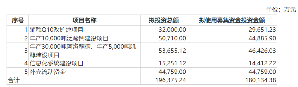 本次发行可转债,金达威拟募集资金18.01亿元,主要用于辅酶Q10改扩建等扩产项目、信息化系统建设项目、补充流动资金等。