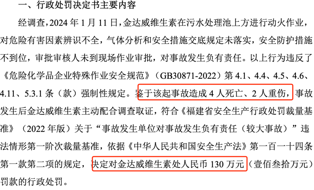 此外,有媒体报道,厦门市海沧区应急管理局今年5月27日对金达威维生素有限公司作出了一则行政处罚。