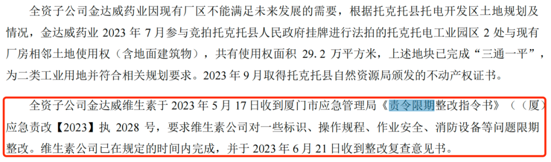 金达威表示,金达威维生素已在规定的时间内完成,并于2023年6月21日收到整改复查意见书。