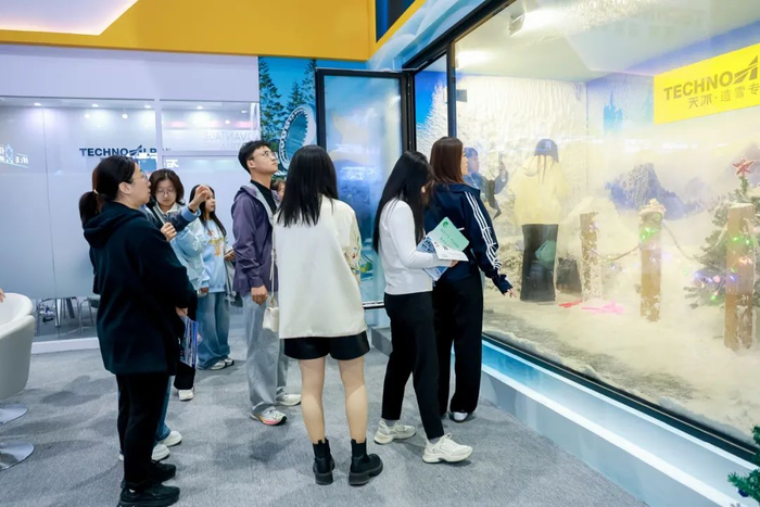 展会现场,全球冰雪行业领军企业意大利天冰集团,现场展示SnowRoom雪屋,创新全自然冰雪环境,通过先进的温控与制冷技术,让参观者在展会现场就能体验纯净的冰雪世界,展示了天冰在小型空间环境造雪方面的技术领先性,让大众充分感受粉雪雪质天花板,尽享冰雪乐趣。