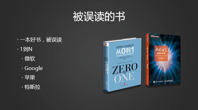 因为看完这本书,大家都相信,中国现在缺的就是从0到1的突破或者创新。Peter Thiel的观点是,硅谷做的是从0到1,但是中国做的是从1到N,当硅谷有一个公司做成一件事的时候,中国出来复制,做得很成功,比如百度、阿里巴巴等等,都是这样。他举了4个从0到1的例子,一个是微软,一个Google,一个苹果,一个特斯拉。