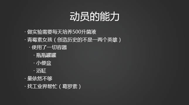 所以你会发现从0到1的发明可能没有什么用。当然,你说过去人不懂得科学,当懂得科学,从0到1就有用。我们知道一个青霉素的传说。英国有个大夫叫弗莱明,他想研制一种药来杀死细菌。有一次他出去度假,回来以后发现细菌培养皿长毛了,霉菌把细菌都杀死了。他有一个有准备的头脑,于是发现了青霉素。后来还获得了诺贝尔奖。