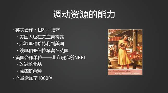 到美国之后,他们首先想办法改进培养基。当时美国中部产玉米,他们就发现用玉米汁来培养青霉菌,产量提高了很多倍。第二,寻找更好的菌种。当时哈特利手下一个实验员叫玛丽,有一天她在水果摊看到一个哈密瓜绿油油的,就拿回去了。结果发现这个菌种正好是可以用的,产量又提高很多。再加上后来很多美国大学的研究人员,尝试了各种科学手段,最终使得产量提高了1000倍。