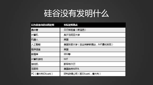 实际的情况是,硅谷没有发明什么。我们知道的这些科技,都不是硅谷发明的。晶体管,贝尔实验室发明的,一直到PC,你想象不到,是意大利人发明的,好利获得这家公司。曾经是意大利第二大工业公司。