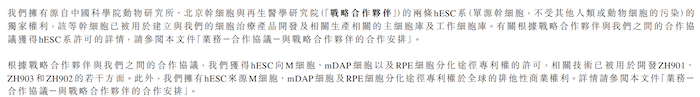 根据合作协议,对方为泽辉生物提供两条临床级人胚干细胞(hESC)系的排他性专利,以及M细胞、中脑多巴胺前体(mDAP)细胞及视网膜色素上皮(RPE)细胞的相关专利权在全球范围的排他性专利,以研究、开发、生产要约销售及商业化源自干细胞的针对所有潜在适应症的治疗产品。根据该协议,泽辉生物必须向合作伙伴支付包括首期付款、里程碑付款及特许权使用费付款等。