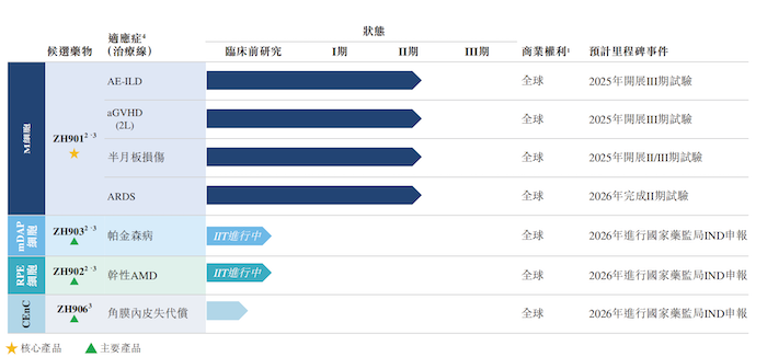 公司开发了由四类PSC来源细胞治疗产品组成的全面及差异化产品管线,涵盖七种适应症,包括间质性肺疾病急性加重(“AE-ILD”)、急性移植物抗宿主病(“aGVHD”)、半月板损伤、急性呼吸窘迫综合征(“ARDS”)、帕金森病、干性年龄相关性黄斑变性(“AMD”)及角膜内皮失代偿。
