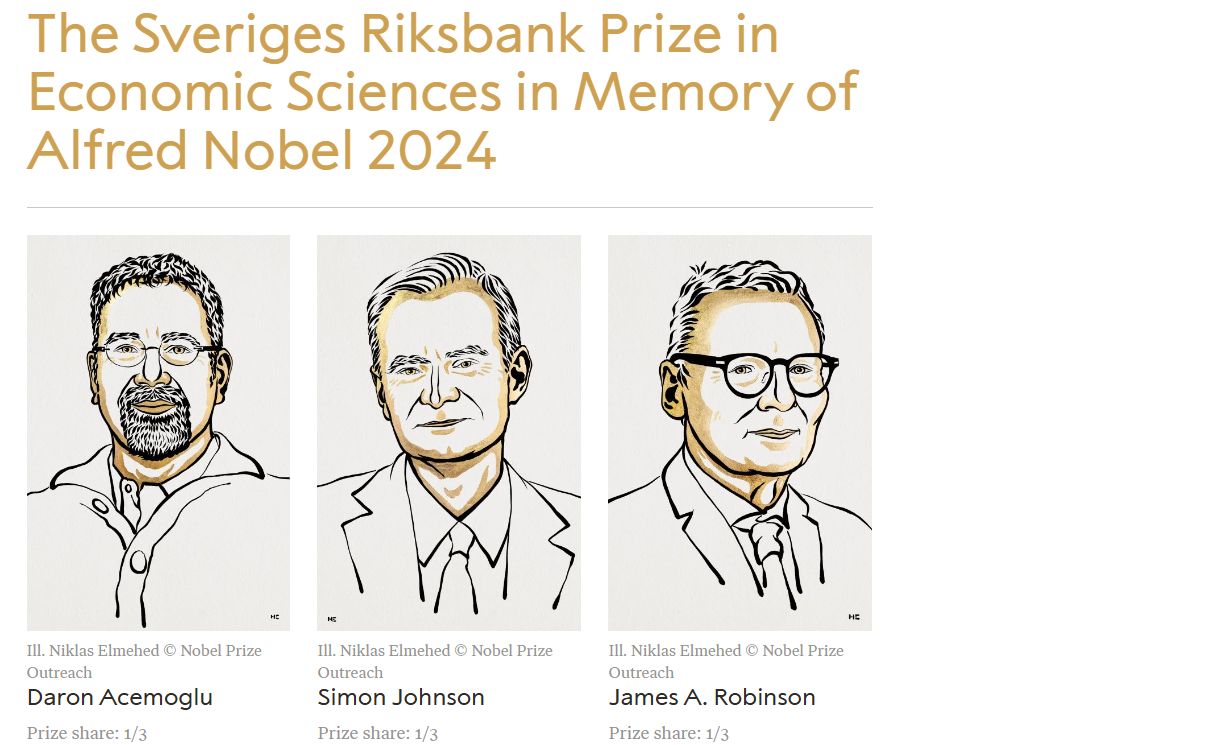 瑞典皇家科学院诺贝尔奖评审委员会周一宣布,将2024年诺贝尔经济学奖授予达隆·阿西莫格鲁(Daron Acemoglu)、西蒙·约翰逊(Simon Johnson)、詹姆斯·罗宾逊(James A. Robinson),以表彰他们“对制度如何形成及其影响繁荣的研究”。