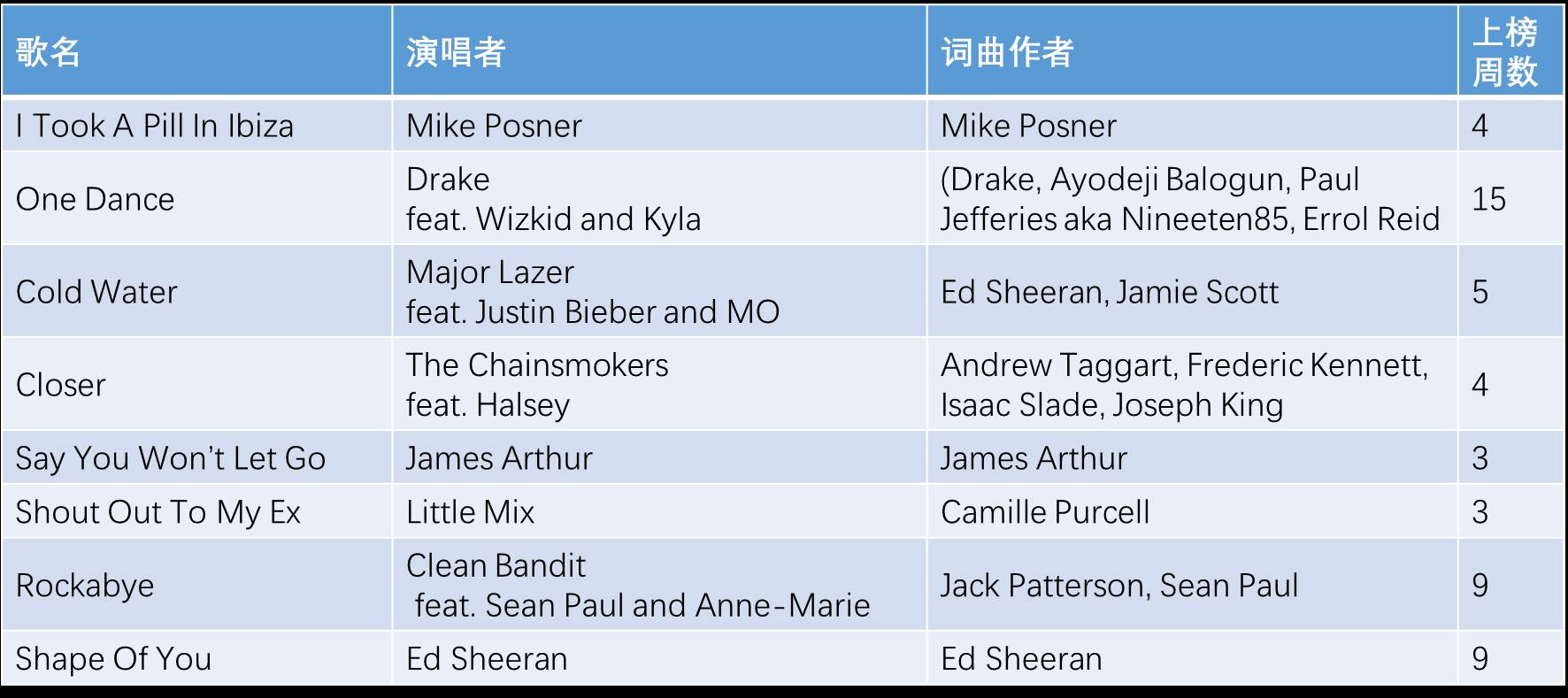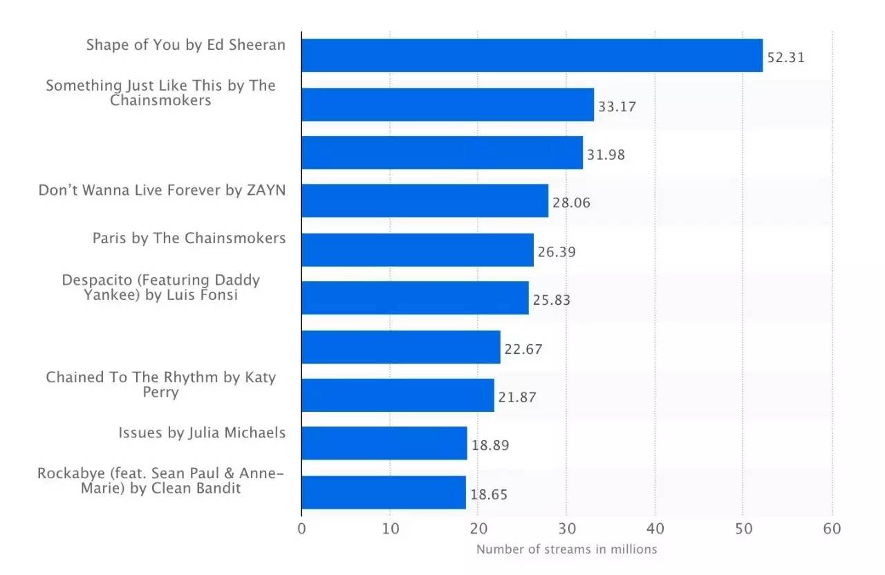根据Statista的数据,2017年三月初截止统计的每周被全球收听最多次的流媒体歌曲榜单中,《Shape of You》以5231万次名列第一,远远高出第二位The Chainsmokers《Something Just Like This》3371万次的播放量。