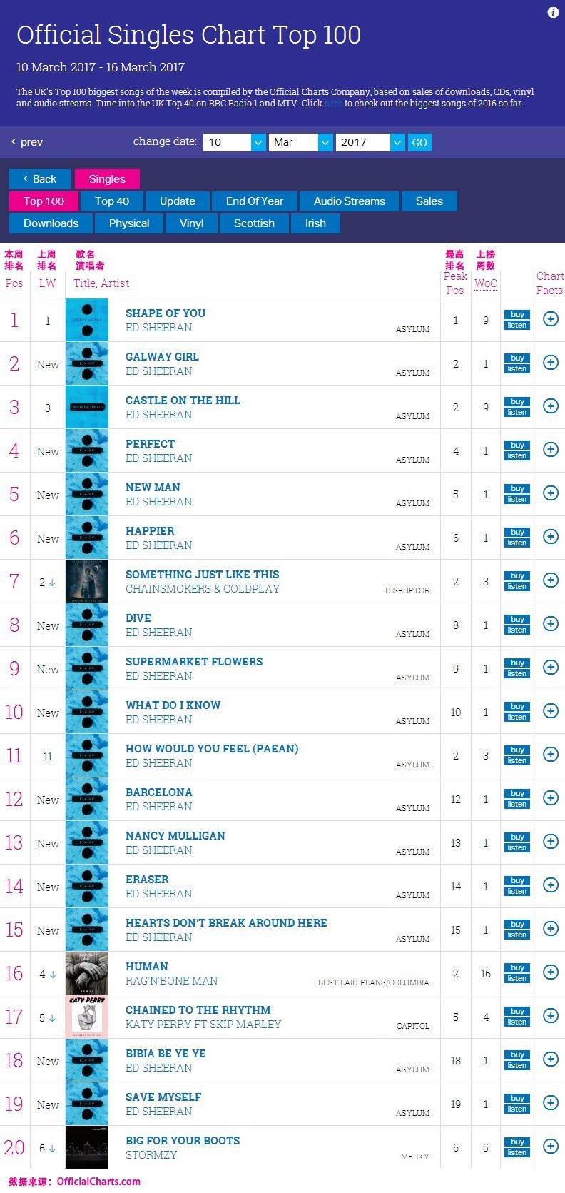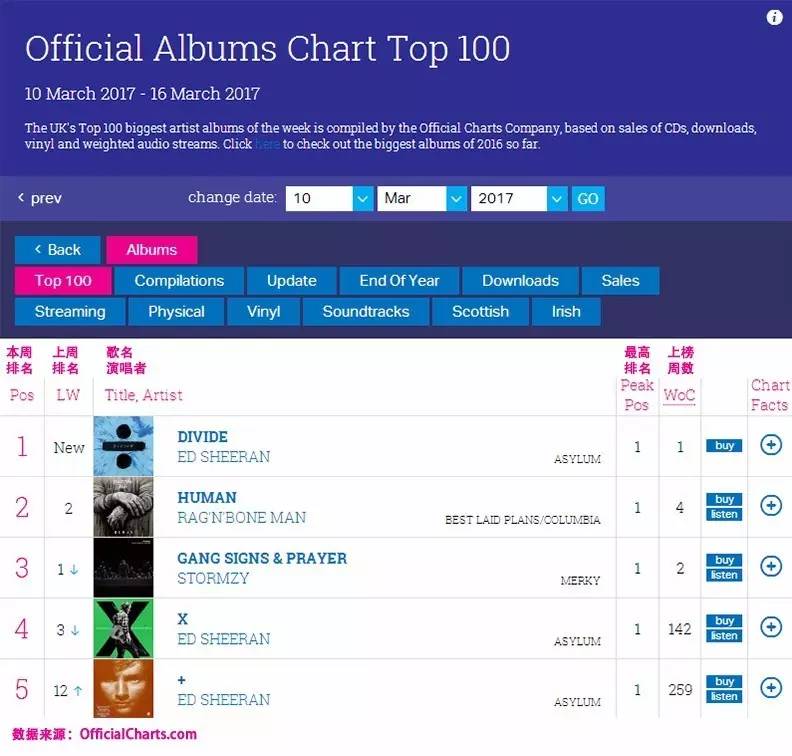另外,在单曲方面,黄老板还达成了一个Official Singles Chart上前无古人的成就,专辑《÷》中的16首歌全部登上了这个榜单的前20排名。