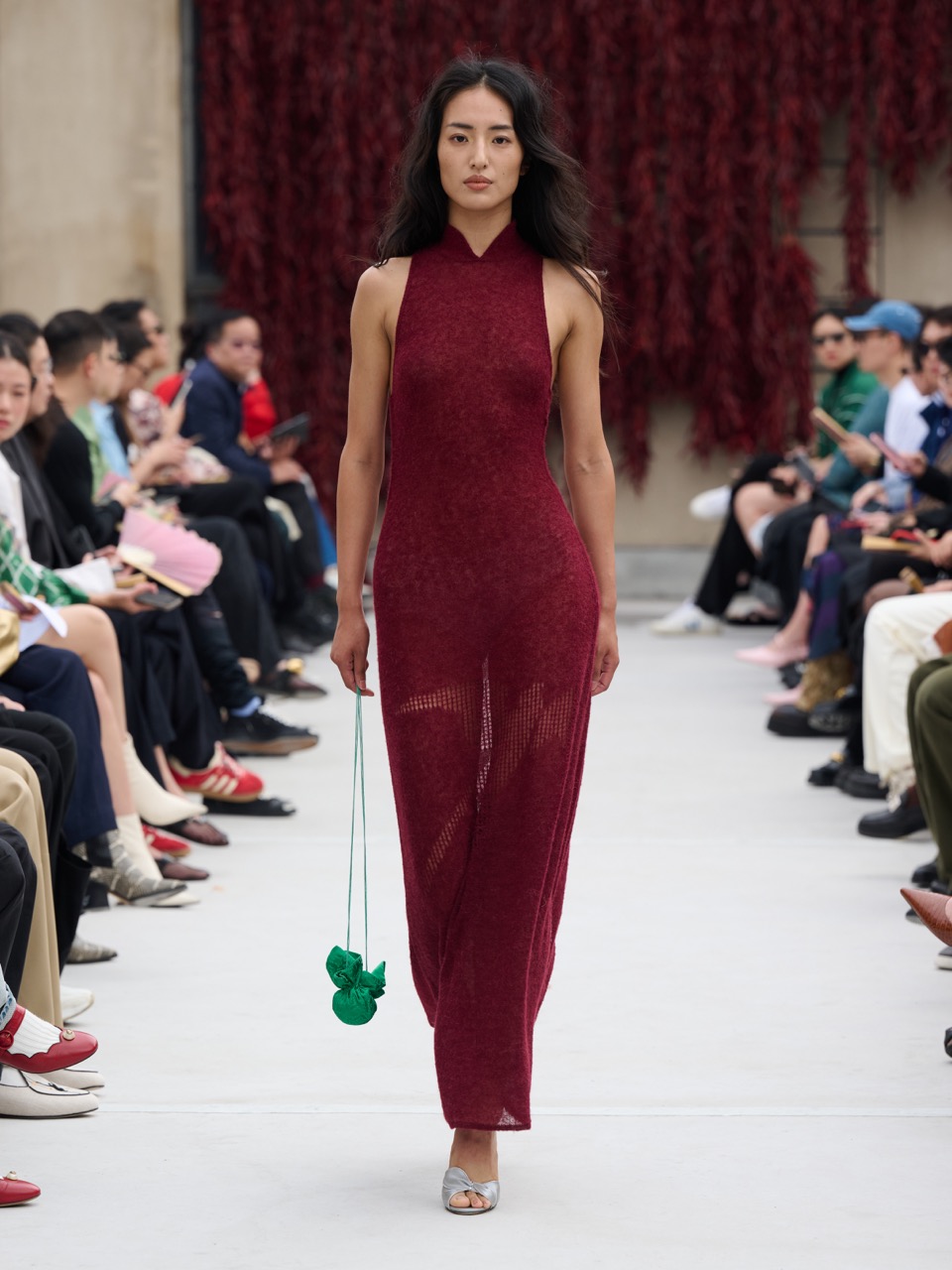 值得一提的是,设计师对传统元素的现代演绎。葡萄酒红色针织长连衣裙上的"剪燕"镂花,以及"荔枝"红Meng Top的旗袍元素,都彰显了品牌对中国传统服饰的创新解读。同时,男装系列的回归也为整个系列增添了更多可能性。